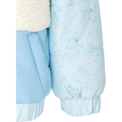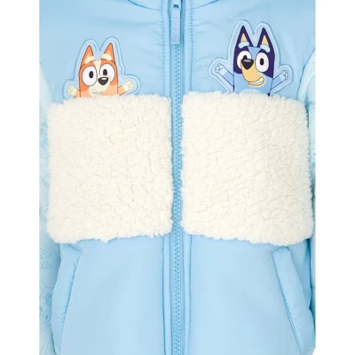 Come meet Bluey the 6 year old Blue Heeler pup and her younger sister Bingo! Watch Bluey and Bingo come to life through your little oneâs friendly and fun personality. Your child is going to love playing indoors or outdoors in their new Bluey Zip Up Puffer Jacket.