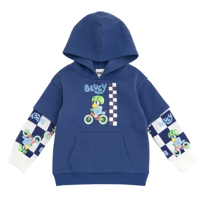 Come meet Bluey the 6 year old Blue Heeler pup and her younger sister Bingo! Watch Bluey and Bingo come to life through your little oneâs friendly and fun personality. Your child is going to love playing indoors or outdoors in their new Bluey Fleece Hangdown Hoodie.