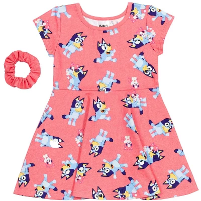 - Officially licensed Bluey toddler girls cute and stylish short sleeve dress and elastic hair scrunchie