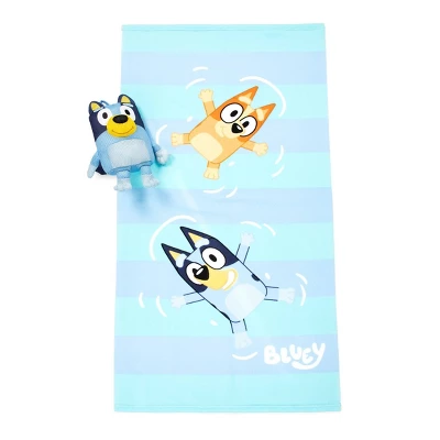 Bluey knows the importance of bath time and won’t let her young fans face it alone. Now bath time can be something young ones look forward to. This amazing set includes 1 bath time buddy and 1 towel. The towel measures 50 inches long by 25 inches wide. The pillow measures 13 inches by 8 inches. The bath buddy is hand wash and hang dry. The Towel is machine wash and tumble dry. This set is 100% polyester.