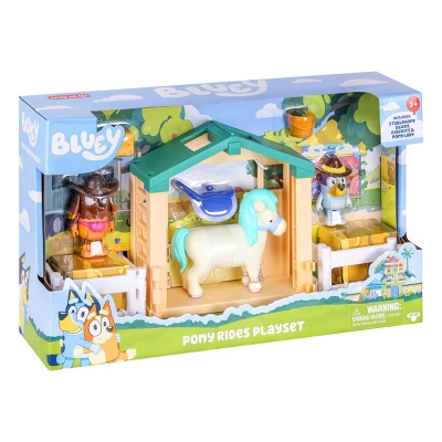 - Bring the fun and imaginative play of Bluey and her family & friends home with the exclusive Bluey’s Pony Ride Playset