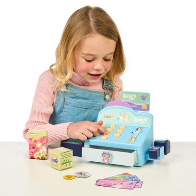 - The Bluey Cash Register comes with a toy credit card and heaps of Dollar Bucks to spend!