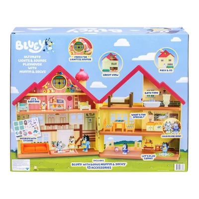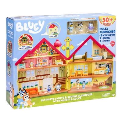 - The Bluey Ultimate Lights & Sounds Playhouse includes with 2.5″ – 3″ figures of Bluey and her cousins, Muffin and Socks.