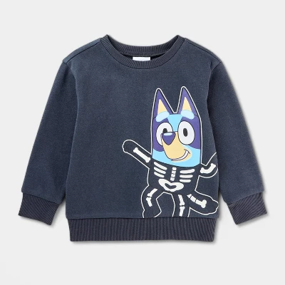 Get your little one ready for some festive fun with the Toddler Bluey Bingo Halloween “Booey” Fleece Sweatshirt in Black. Featuring an adorable Bluey character graphic on the front and a playful âBooeyâ print on the back, this pullover brings cute energy to cooler days. Made from soft, midweight fleece, it offers warmth without the bulk, making it perfect for pumpkin patches, trick-or-treating or lounging at home. The regular fit, classic round neckline and waist-length cut ensure easy layering and all-day comfort. Featuring glow-in-the-dark bones on the front and text on the back.