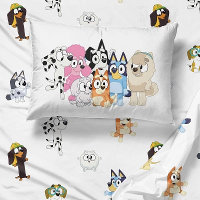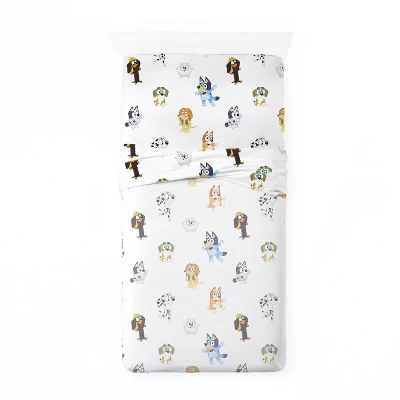 This sheet set is perfect for all the young Bluey super fans out there. This twin sheet set is soft and warm. This sheet set is part of the larger Bluey bedding collection available here at Target. This sheet set includes 1 flat sheet, 1 fitted sheet, and 1 pillowcase. This twin sheet set measures: Flat sheet is 96 inches long by 66 inches wide, Fitted sheet is 75 inches long by 39 inches wide, and the pillowcase is 20 inches by 30 inches. This item consists of 100% polyester. This sheet set is machine wash cold and tumble dry low. Comforter sold separately.